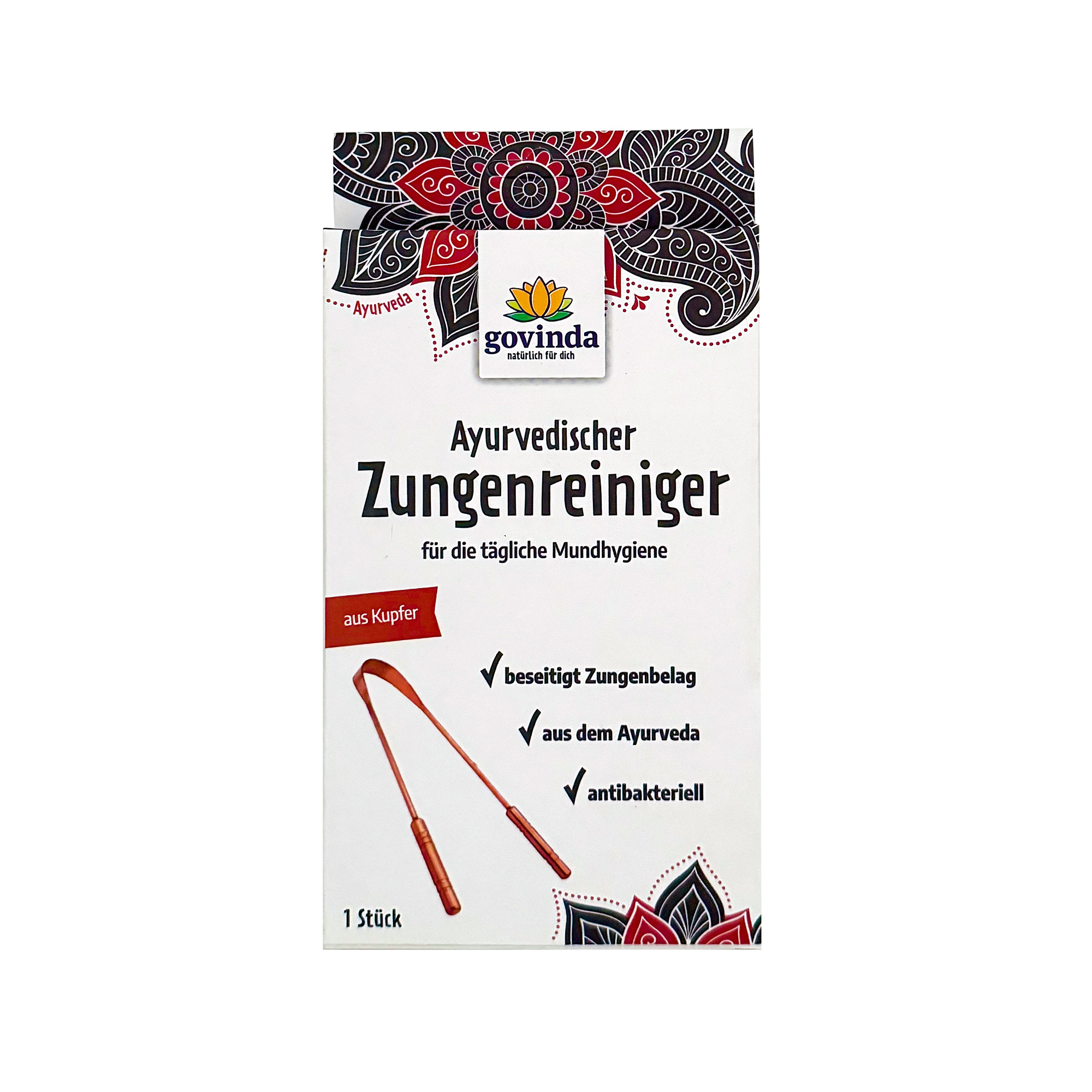 Il puliscilingua in rame Govinda è molto robusto e ha due manici pratici e dalla forma meravigliosa.